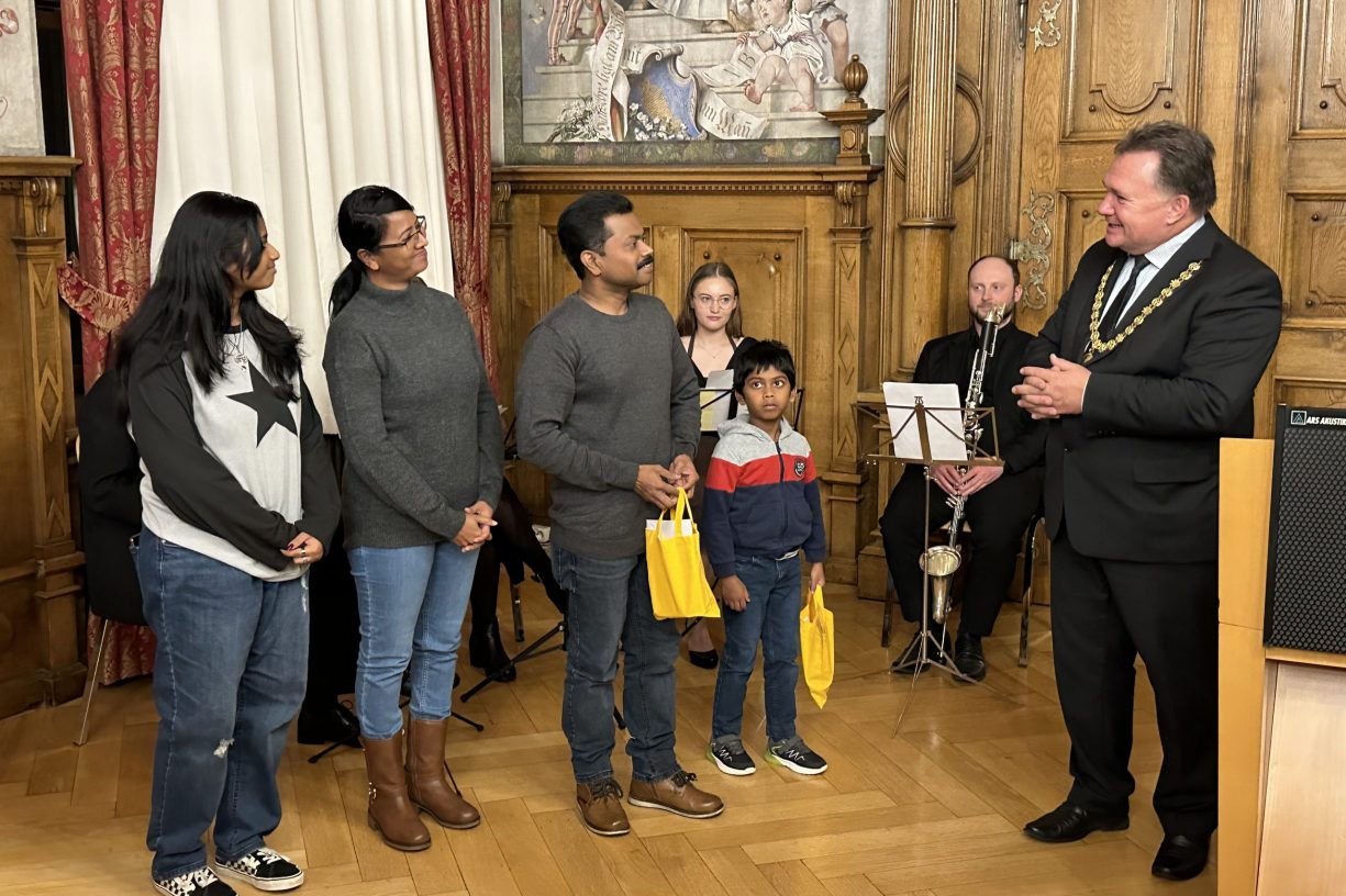 Unter den neuen Bürgern befand sich auch Herr John Philip, begleitet von seiner Ehefrau Susan und den beiden Kindern Jessica und Jerome, die aus Südindien stammen. Da die Einbürgerung dieses liebevollen Familienverbunds von unserer Stiftung während des Prozesses unterstützt wurde, war auch Vorstandsvorsitzender Wolfgang Groß zu diesem bedeutsamen Ereignis eingeladen.