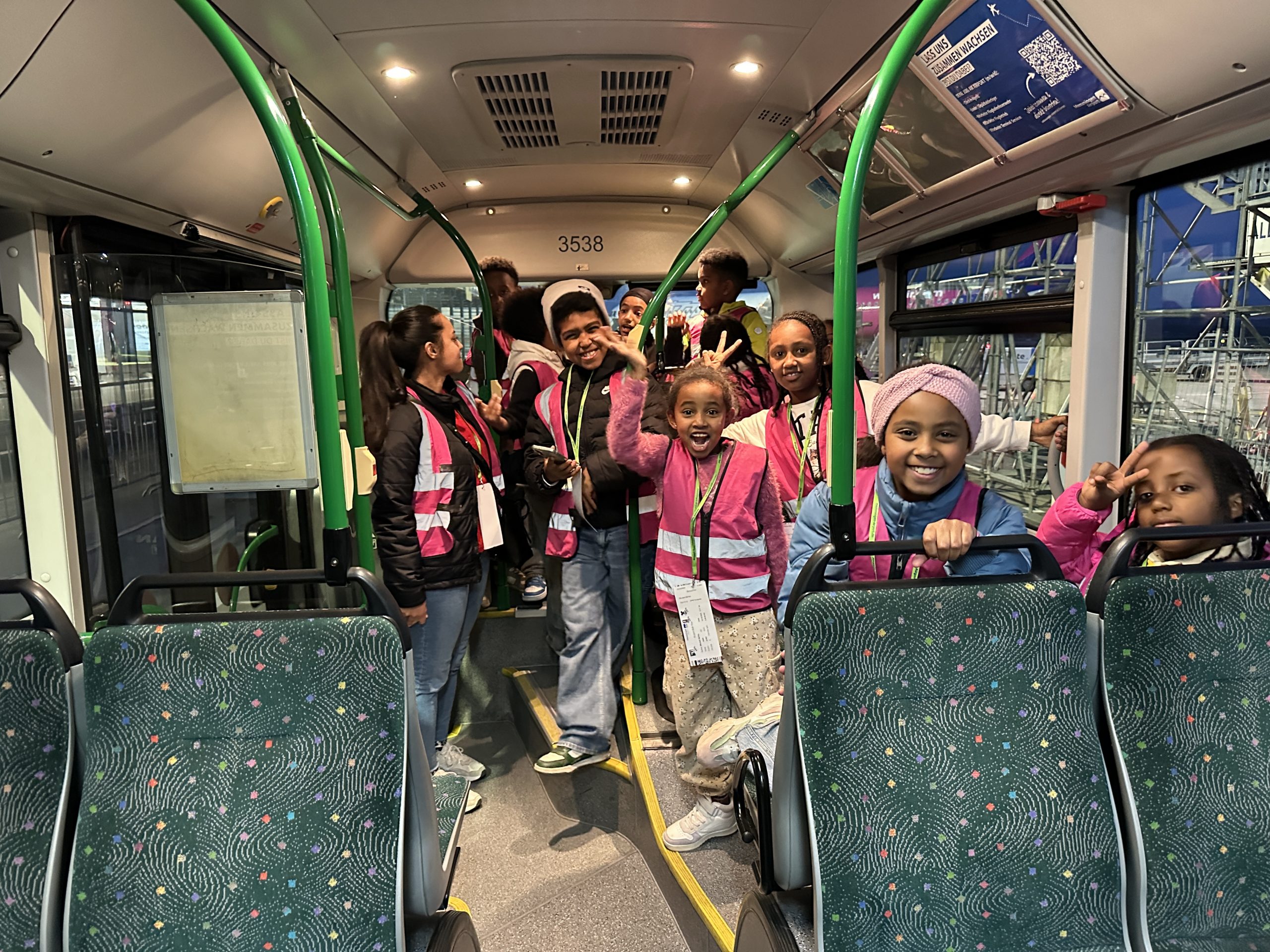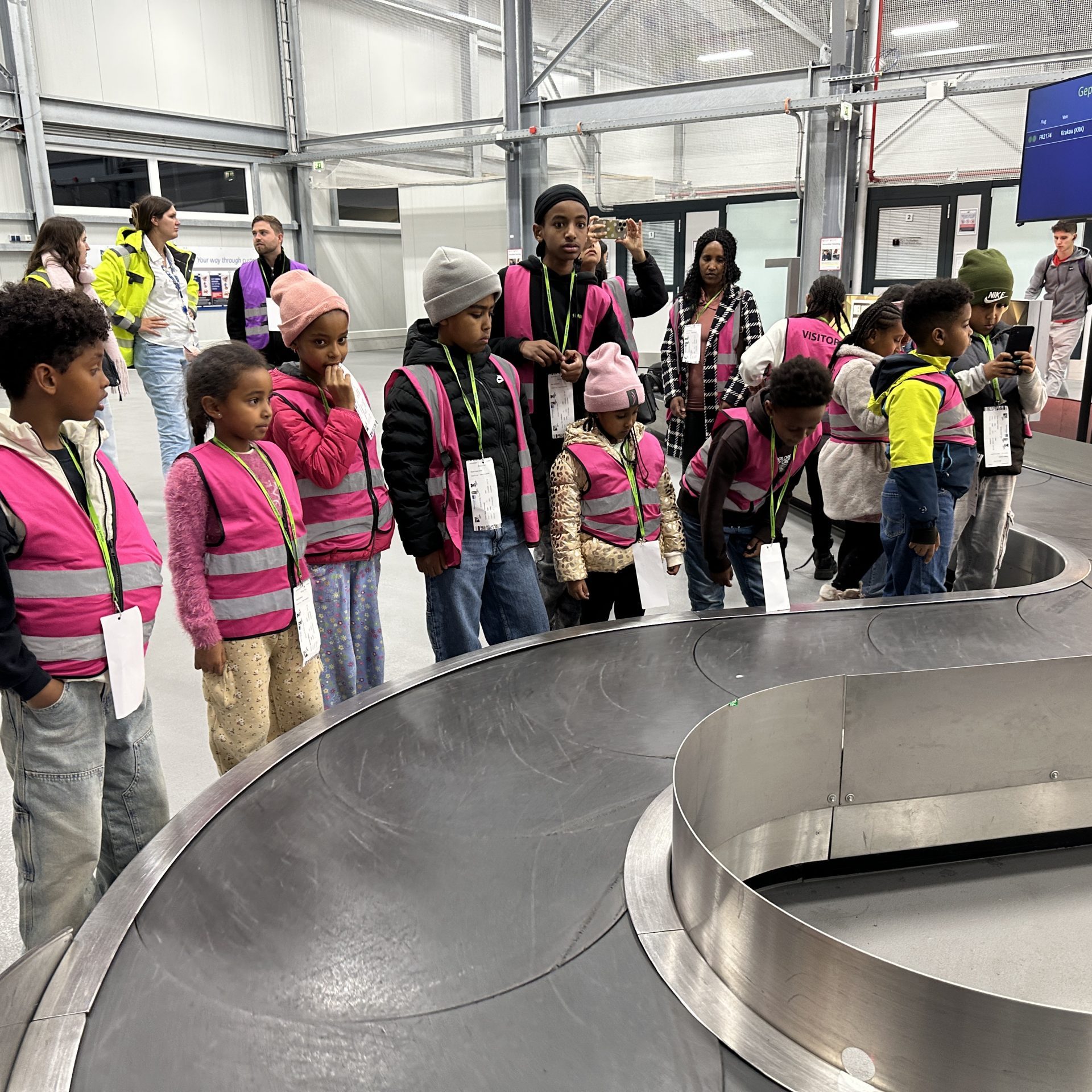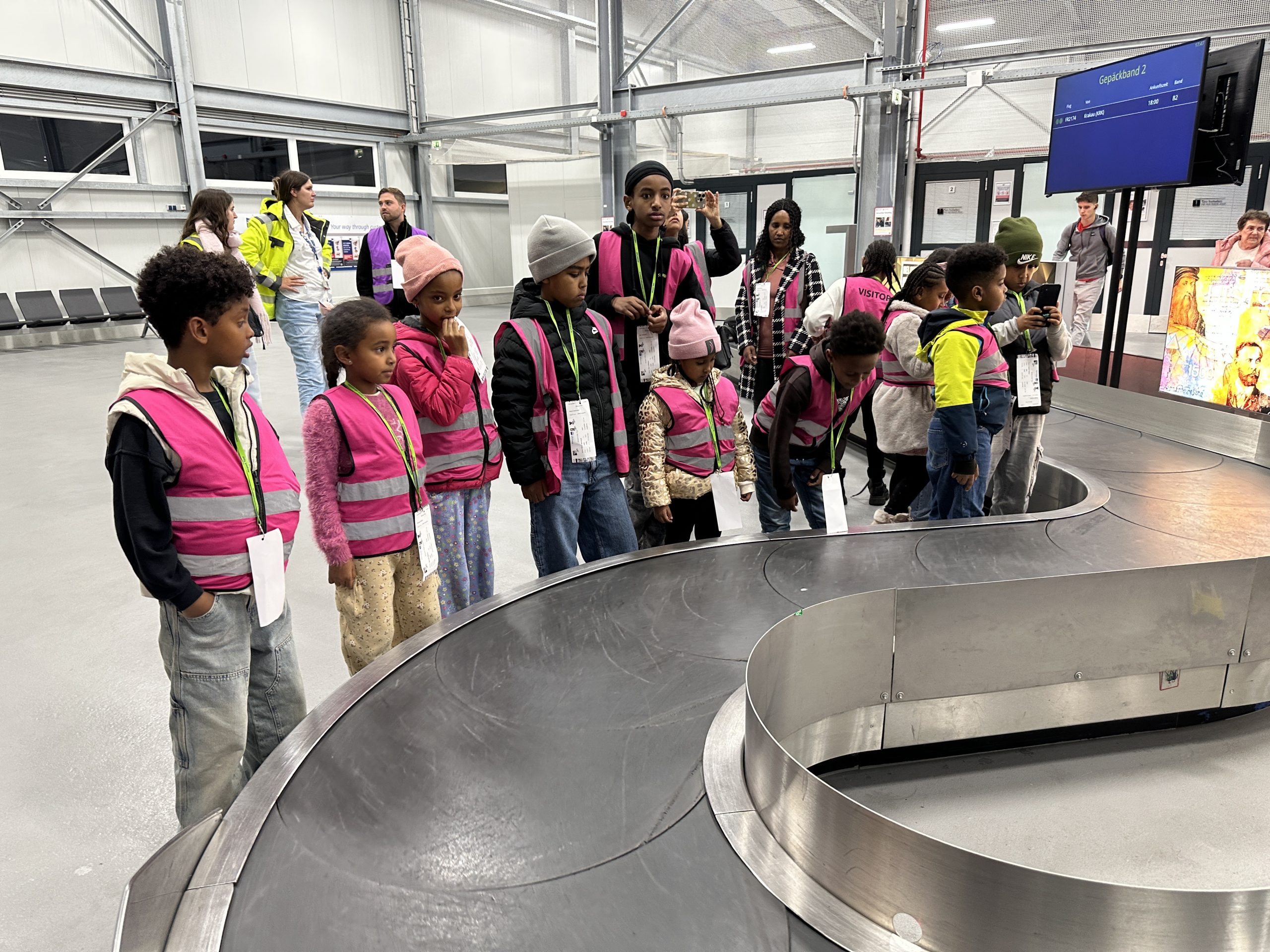 Bereits beim Check-in fühlten sich die Kinder wie echte kleine Reisende. Mit eigenen Besucherausweisen ging es anschließend mit einem bereitgestellten Flughafenbus in verschiedene Bereiche des Geländes. Neben dem Besuch des Gepäckbandes und anderer Arbeitsbereiche stellten die Kinder unzählige Fragen, die mit großer Geduld und Begeisterung beantwortet wurden.